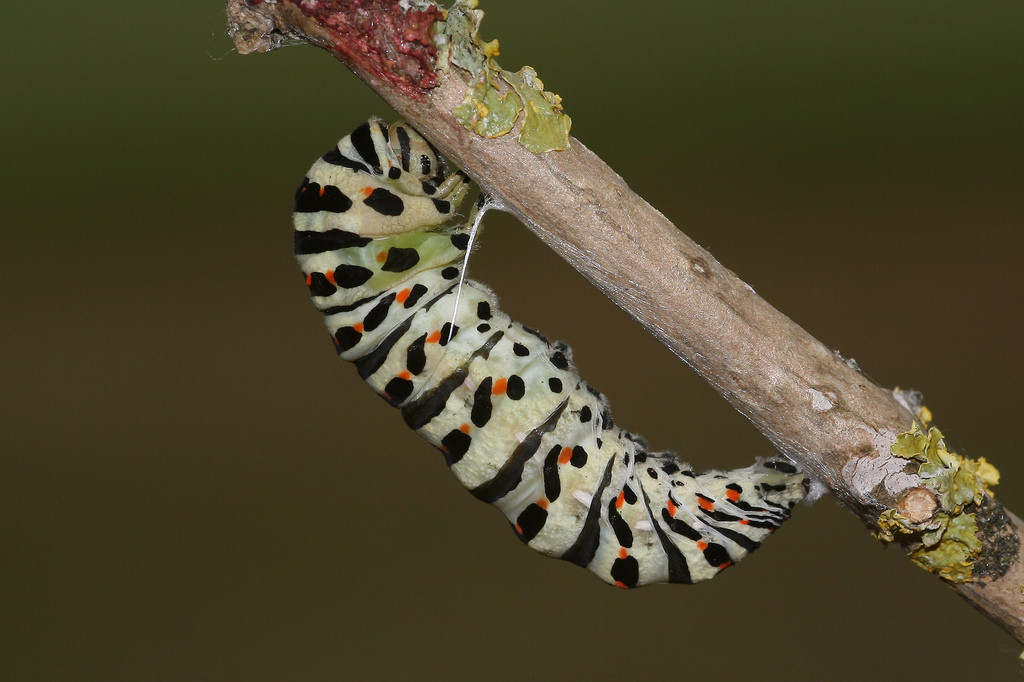 "European Swallowtail (Papilio machaon gorganus) larva pupating (2)" by Deanster1983 via Flickr, Creative Commons Attribution-NoDerivs.